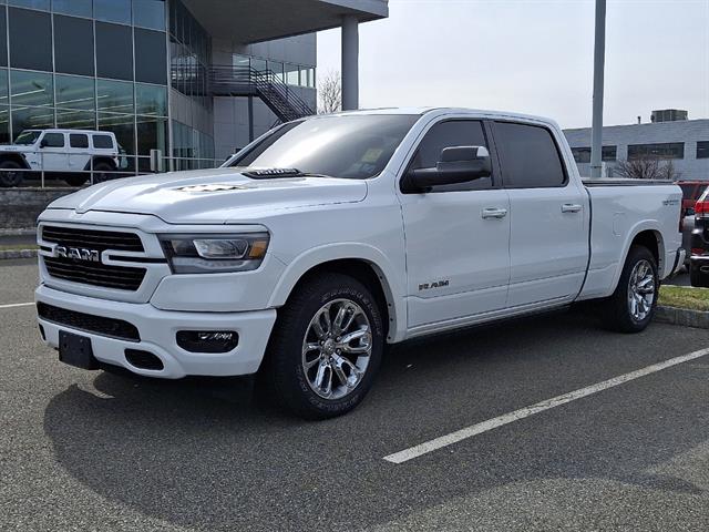 Experience premium power and comfort with this White 2022 Ram 1500 Laramie Crew Cab 4x4, featuring a 6.4 ft. bed and HEMI 5.7L V8 engine paired with an 8-speed automatic transmission. Enjoy the luxury of leather-trimmed bucket seats, heated and ventilated front seats, and a heated steering wheel. Advanced tech includes UConnect 5 Nav with an 8.4-inch touchscreen, wireless Apple CarPlay and Android Auto, and a wireless charging pad. The Laramie Level 2 Equipment Group, Advanced Safety Group, and ParkSense Front & Rear Park Assist bring added convenience and safety. Tackle any job with the Bed Utility Group, Class IV trailer hitch, power-folding trailer tow mirrors, and anti-spin rear differential. Stand out with the Sport Appearance Package, LED headlights, and aluminum alloy wheels. The dual-pane panoramic sunroof, tri-fold tonneau cover, and MOPAR power running boards complete this versatile, feature-rich pickup-ready for work or play.